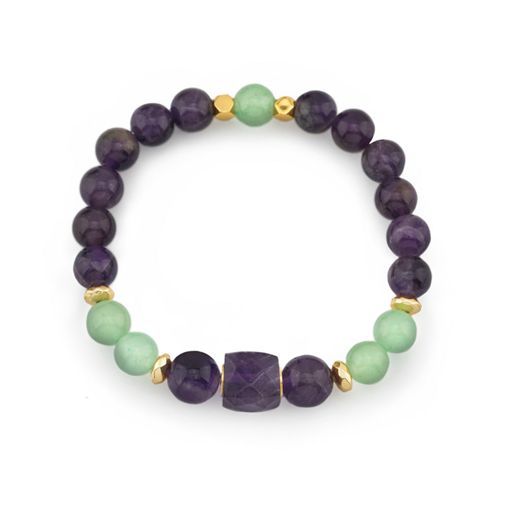 Amethyst & Green Aventurine Beaded Gemstone Stretch Bracelet with Amethyst Centerpiece