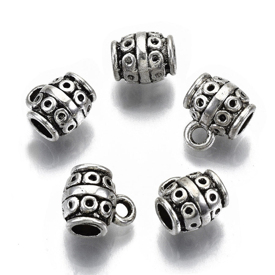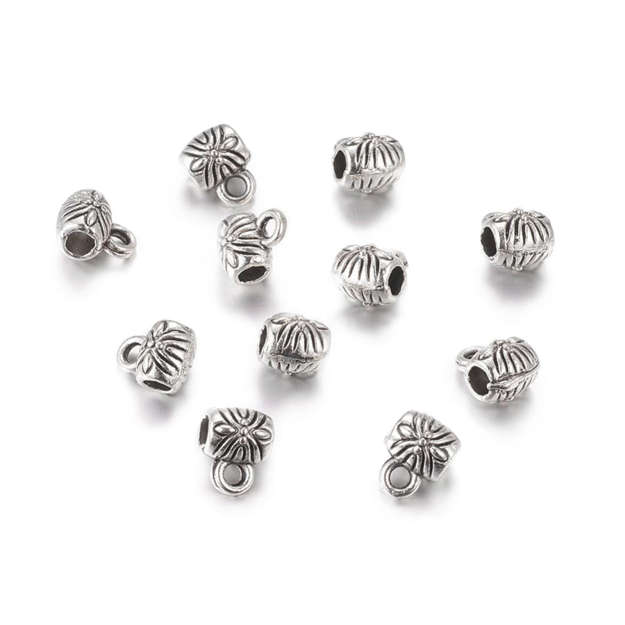 Bail beads, also known as bead bails, are components used in jewelry making that allow for easy attachment of a pendant or charm to a chain or cord. They are typically small and cylindrical in shape, with a loop or ring on one end and an opening on the other end that fits a pendant or charm. They come in a variety of shapes, sizes and colors. They are typically made from metal, alloy, stainless steel or brass.