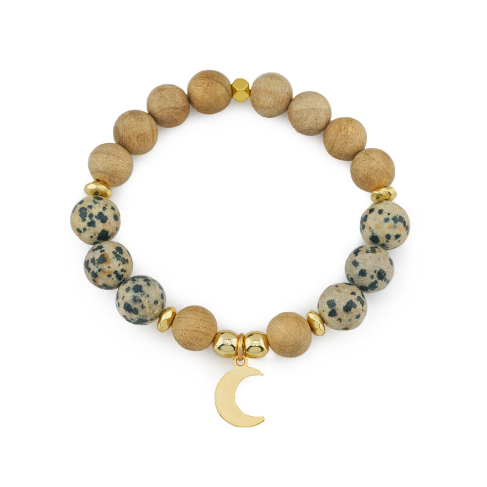 - Material: 10mm Dalmatian Jasper beads, 10mm Burlywood wooden beads, 6mm gold hematite accents, and a stainless steel gold moon charm.