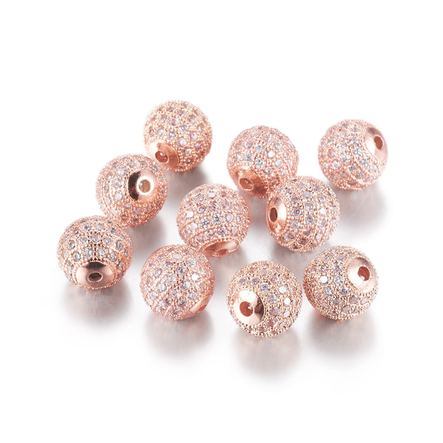 Round Brass Micro Pave Cubic Zirconia Spacer Beads, Rose Gold Color Charm Spacers for DIY Jewelry Making. Focal Beads.